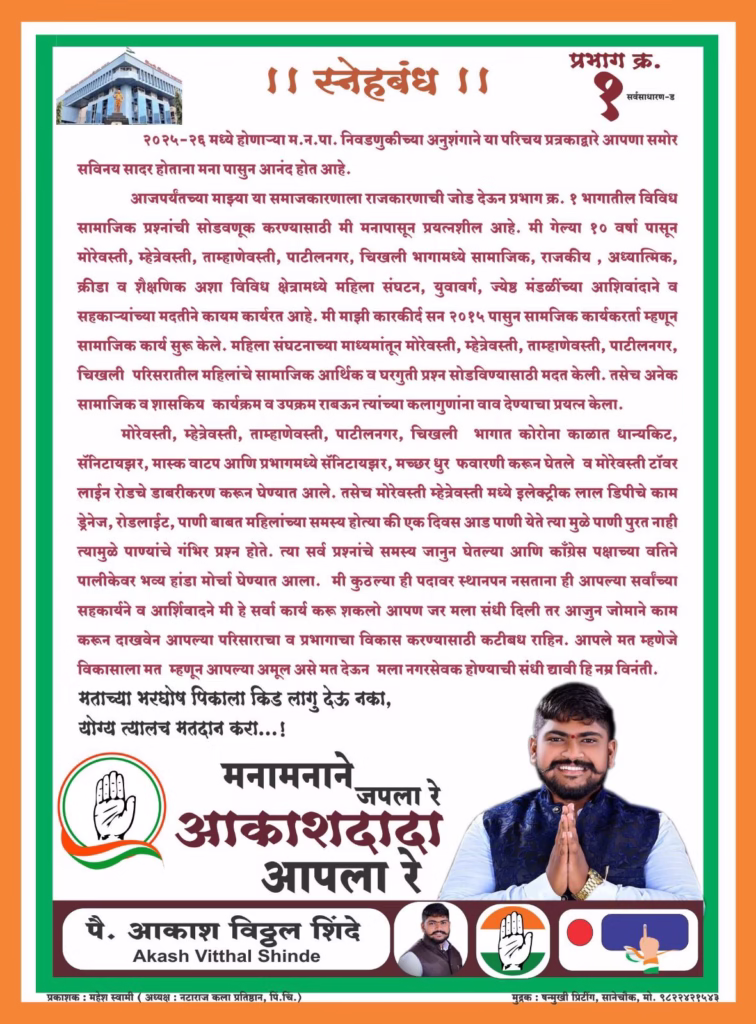 वॉर्ड क्रमांक १ मध्ये यंदाच्या निवडणुकीत राजकारण नव्हे तर थेट संघर्ष, कामाचा हिशोब आणि जनतेचा सवाल केंद्रस्थानी आला आहे. गेल्या अनेक वर्षांपासून मूलभूत सुविधांसाठी झगडणाऱ्या नागरिकांसाठी आता रस्त्यावर उतरून लढणारा उमेदवार म्हणून आकाश विठ्ठल शिंदे यांचे नाव ठळकपणे पुढे येत आहे.