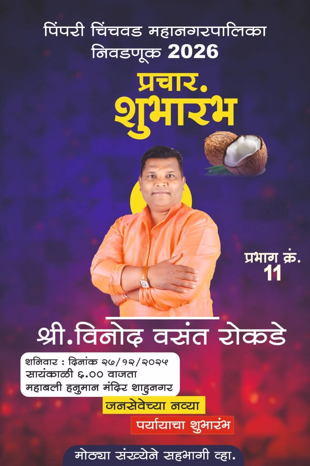 рдкрд┐рдВрдкрд░реА-рдЪрд┐рдВрдЪрд╡рдб рдорд╣рд╛рдирдЧрд░рдкрд╛рд▓рд┐рдХреЗрдЪреНрдпрд╛ рдЖрдЧрд╛рдореА рдирд┐рд╡рдбрдгреБрдХрд╛рдВрдЪреНрдпрд╛ рдкрд╛рд░реНрд╢реНрд╡рднреВрдореАрд╡рд░ рдкреНрд░рднрд╛рдЧ рдХреНрд░рдорд╛рдВрдХ 11 рдордзреНрдпреЗ рд░рд╛рдЬрдХреАрдп рд╣рд╛рд▓рдЪрд╛рд▓реАрдВрдирд╛ рд╡реЗрдЧ рдЖрд▓рд╛ рдЕрд╕реВрди, рдкреНрд░рднрд╛рдЧ рдХреНрд░рдорд╛рдВрдХ 11 рдирд┐рд╡рдбрдгреВрдХ рдкреНрд░рдЪрд╛рд░ рдЕрдзрд┐рдХреГрддрдкрдгреЗ рд╕реБрд░реВ рдЭрд╛рд▓рд╛ рдЖрд╣реЗ. рд╢рд╛рд╣реВрдирдЧрд░ рдпреЗрдереАрд▓ рдорд╣рд╛рдмрд▓реА рд╣рдиреБрдорд╛рди рдордВрджрд┐рд░ рдкрд░рд┐рд╕рд░рд╛рдд рдкрд╛рд░ рдкрдбрд▓реЗрд▓реНрдпрд╛ рд╢реНрд░реА. рд╡рд┐рдиреЛрдж рд╡рд╕рдВрдд рд░реЛрдХрдбреЗ рдпрд╛рдВрдЪреНрдпрд╛ рдкреНрд░рдЪрд╛рд░ рд╢реБрднрд╛рд░рдВрднрд╛рдЪреНрдпрд╛ рдирд╛рд░рд│рдлреЛрдб рдХрд╛рд░реНрдпрдХреНрд░рдорд╛рд▓рд╛ рдирд╛рдЧрд░рд┐рдХрд╛рдВрдЪрд╛ рдЙрддреНрд╕реНрдлреВрд░реНрдд рдкреНрд░рддрд┐рд╕рд╛рдж рд▓рд╛рднрд▓рд╛.