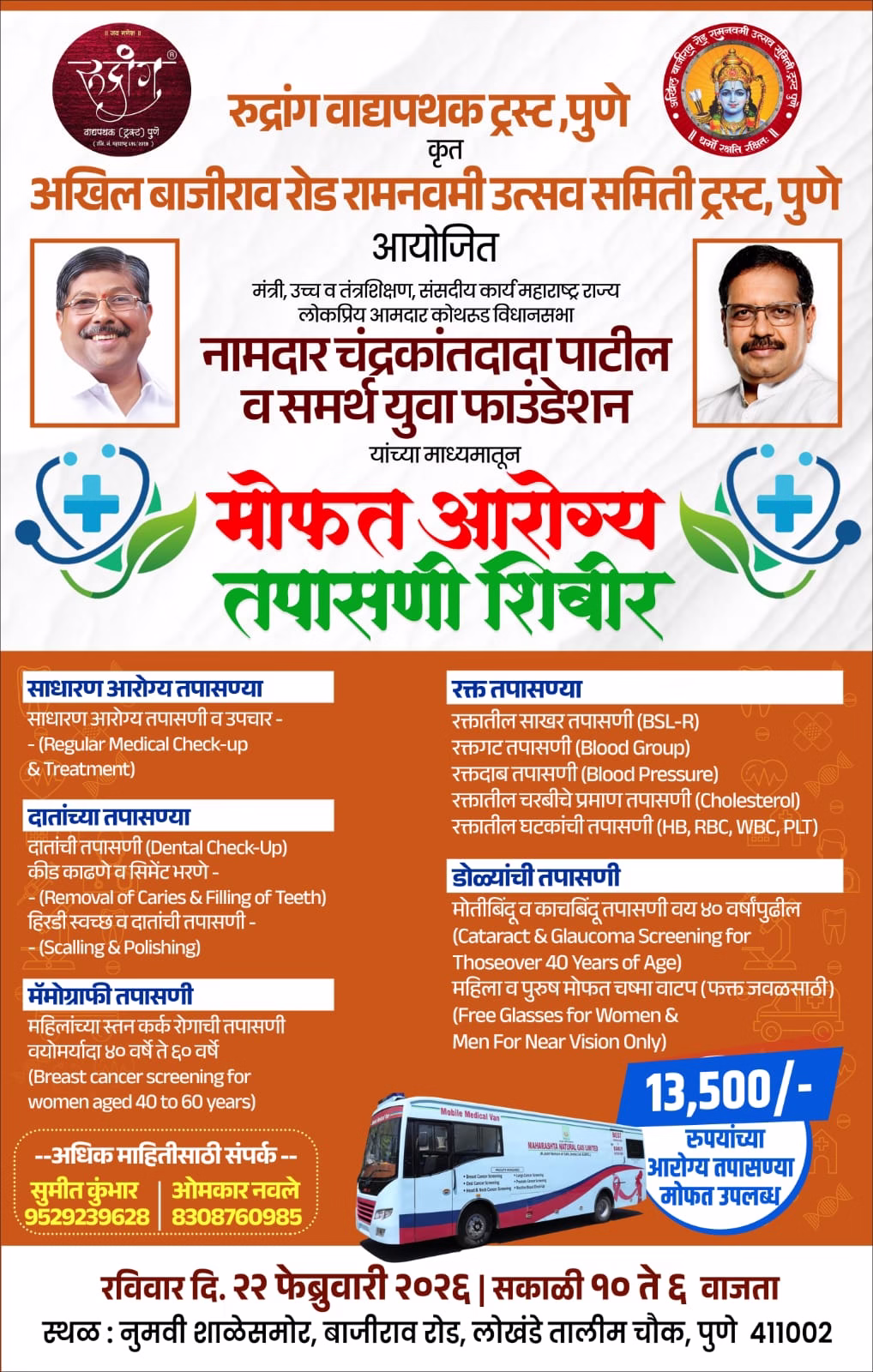 पुणे : रुद्रांग वाद्यपथक ट्रस्ट, पुणे यांच्या पुढाकाराने आणि अखिल बाजीराव रोड रामनवमी उत्सव समिती ट्रस्ट, पुणे यांच्या संयुक्त विद्यमाने रविवारी, दि. २२ फेब्रुवारी २०२६ रोजी मोफत आरोग्य तपासणी शिबिराचे आयोजन करण्यात आले आहे. हे शिबिर सकाळी १० ते सायं. ६ या वेळेत नुमवी शाळेसमोर, बाजीराव रोड, लोखंडे तालीम चौक, पुणे येथे होणार आहे.